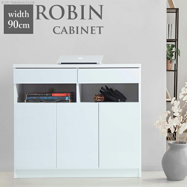 【仕様】本体:プリント紙化粧パーティクルボード前面:合成樹脂化粧繊維板引出し:スライドレール付◎組立式【サイズ】本体:幅90x奥行37.5x高さ80cm重量:約32kg引出内寸(有効):幅37x奥行22x高さ6.5(8.5)cm(2杯)オープン部有効内寸:幅42x奥行25.5x高さ13.5cm(2か所)扉内内寸(左/右)(間口):幅56.5(53.5)/27(25.5)x奥行25.5x高さ43(42)cm棚板サイズ(大/小):幅56/27x奥行24cm・厚み15mmダボピッチ(扉内・背面):下から8cm、6.4cmピッチで5穴背面収納部有効内寸(上段):幅86x奥行7x高さ24.5cm背面収納部有効内寸(下段):幅42x奥行7x高さ43(間口高さ41)cm(2か所)背面収納部棚板サイズ:幅42x奥行8cm・厚み15mm(x2)天板配線カット:12x1.5cm幅木カット:12x1cm株式会社ナカムラ(F0800455)